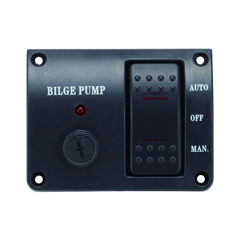 Paneel aus Kunststoff, gewölbte, moderne Form, Breite 82mm, Höhe 63mm. 3-Positions-Schalter, Automatik – OFF – Manuell (Taste), 12 Volt, LED Kontrollleuchte, Sicherungshalter f. Glassicherungen 6,3x32mm (1×20 Amp. im Lieferumfang enthalten). Wasserdicht gemäß IP65