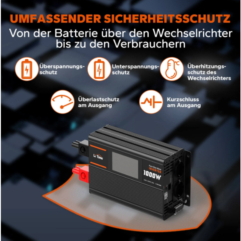 Der 1000W Reine-Sinus-Wechselrichter bietet umfangreiche Sicherheitsfunktionen, darunter Unter- und Überspannungsschutz, Überhitzungsschutz, Überlastschutz, Kurzschlussschutz sowie Eingangsverpolungsschutz, um Ihre Geräte optimal zu schützen.