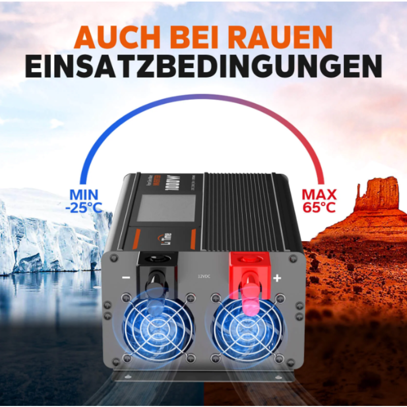 Dank zwei integrierter Kühlventilatoren arbeitet der Wechselrichter zuverlässig bei Temperaturen von –25 °C bis +60 °C. Dadurch eignet er sich ideal für zahlreiche Einsatzbereiche wie Camping, Off-Grid-Solarsysteme und Wohnmobilreisen.