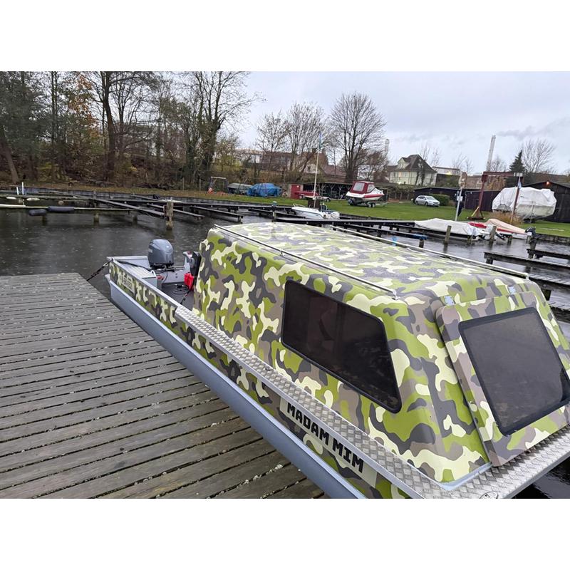 Auf Wunschbesteht die Möglichkeit, die FARBE des Korpus (Aluminium) und der Kabine (Glaslaminat) an den gewählten Farbton anzupassen. Zusätzliche Vinyl-Aufkleber (in unserem Fall Tarnung – Schilf) können mit von Ihnen gelieferten Grafiken, als Schnittgrafiken oder farbiger Foliendruck, realisiert werden. Bei Aufklebern handelt es sich um eine Außenfolie und eine Technologie, die beispielsweise bei Autoaufklebern zum Einsatz kommt. Dies entspricht auch der Lebensdauer der Folie.