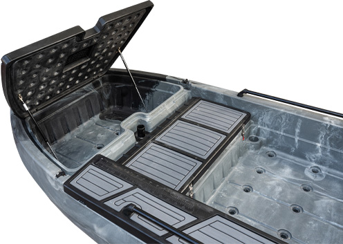 Im Bugbereich erwartet Dich ein großes Casting Deck, das optimale Voraussetzungen für aktives und komfortables Angeln bietet. Der dort integrierte drehbare Casting-Sitz sorgt zusätzlich für Beweglichkeit und Komfort während Deiner Tour.